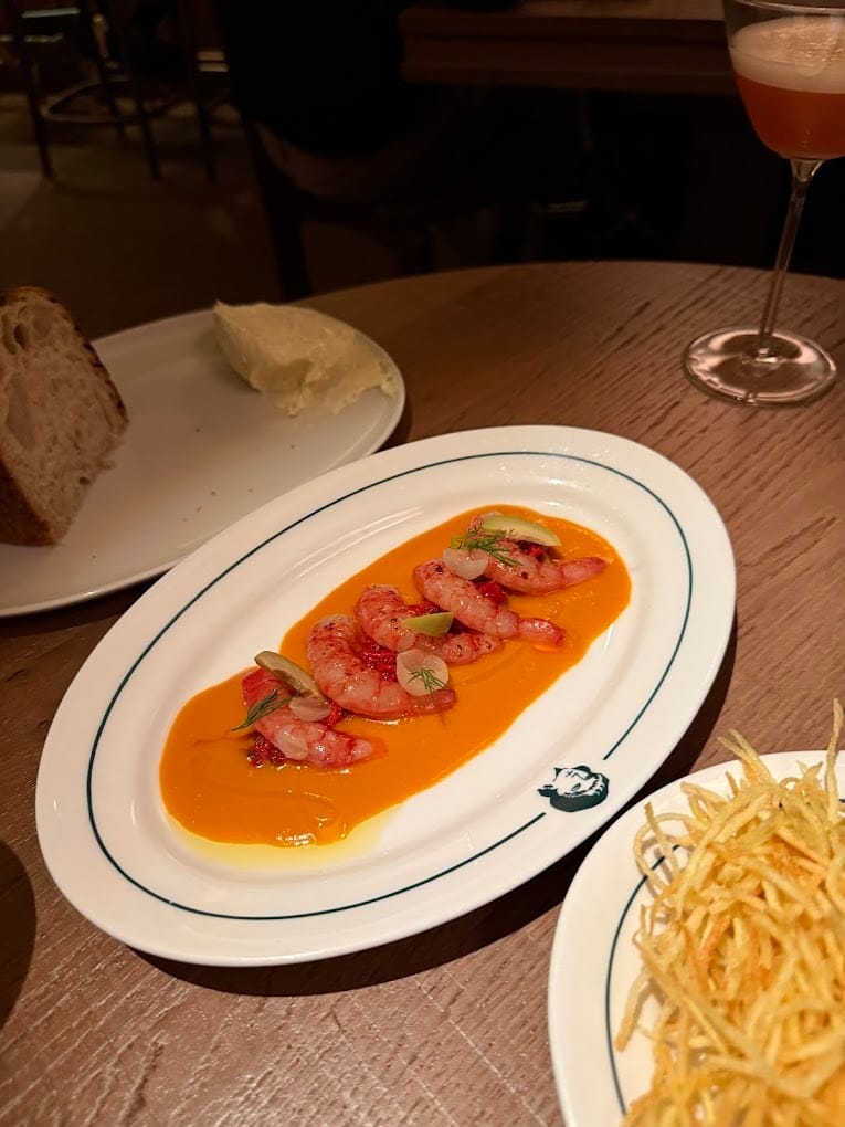 Then: Sicilian prawns, and a jolt of color and salinity that wakes the palate. A personal favourite of mine. Served raw and sweet as sea candy, they arrive barely dressed—just a glisten of oil, a briny kiss of olives, and the sharp flick of pickled onions. You wish there were more prawns just to mop up the divine sauce.