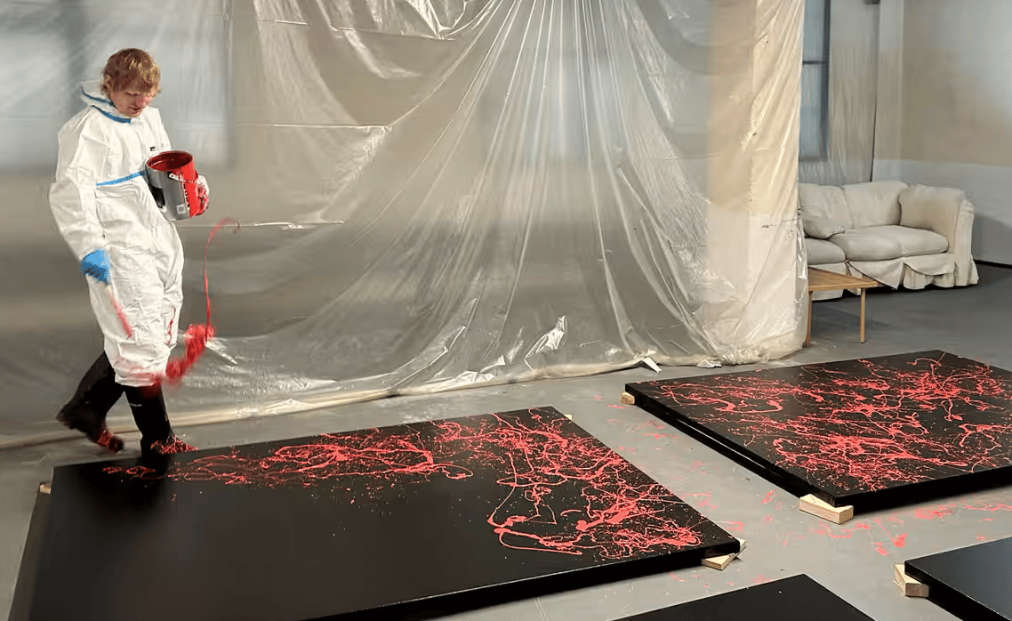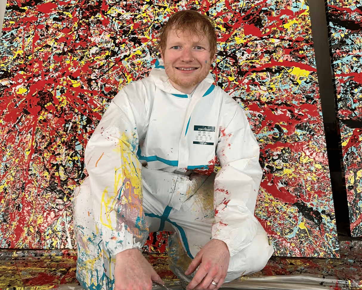 Ed Sheeran posing in front of his splatter art work