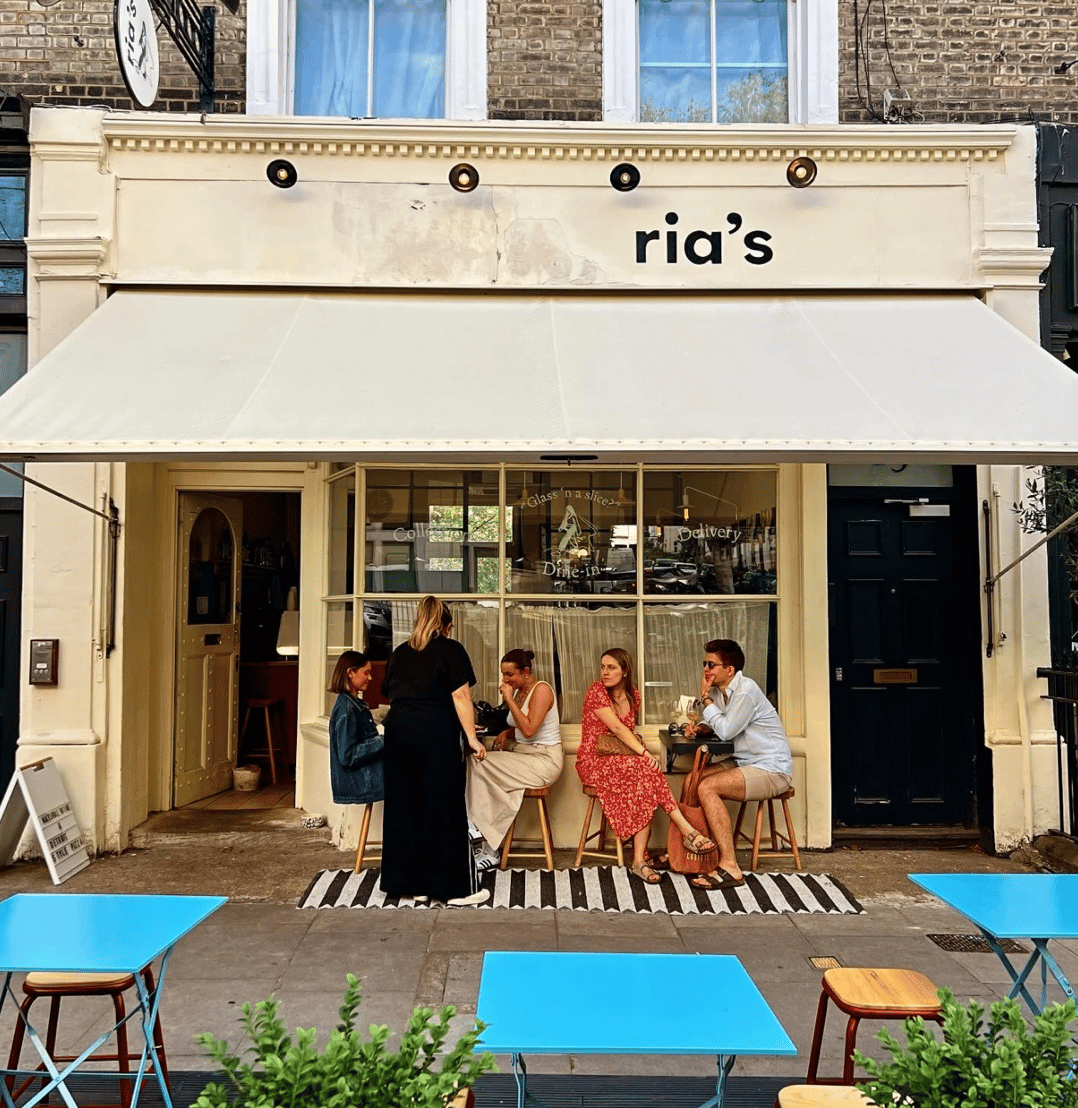 Ria’s was founded in 2023 by husband-and-wife duo Ria and Dave Morgan-Ratcliffe. Located at 29 All Saints Road in Notting Hill, it melds Detroit-style pizza with a natural wine bar, offering a small intimate dining room adorned with Scandi-blue panels, wooden benches, and soft glow lighting.