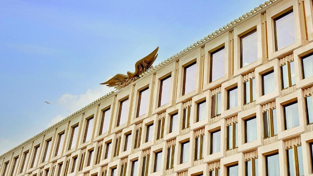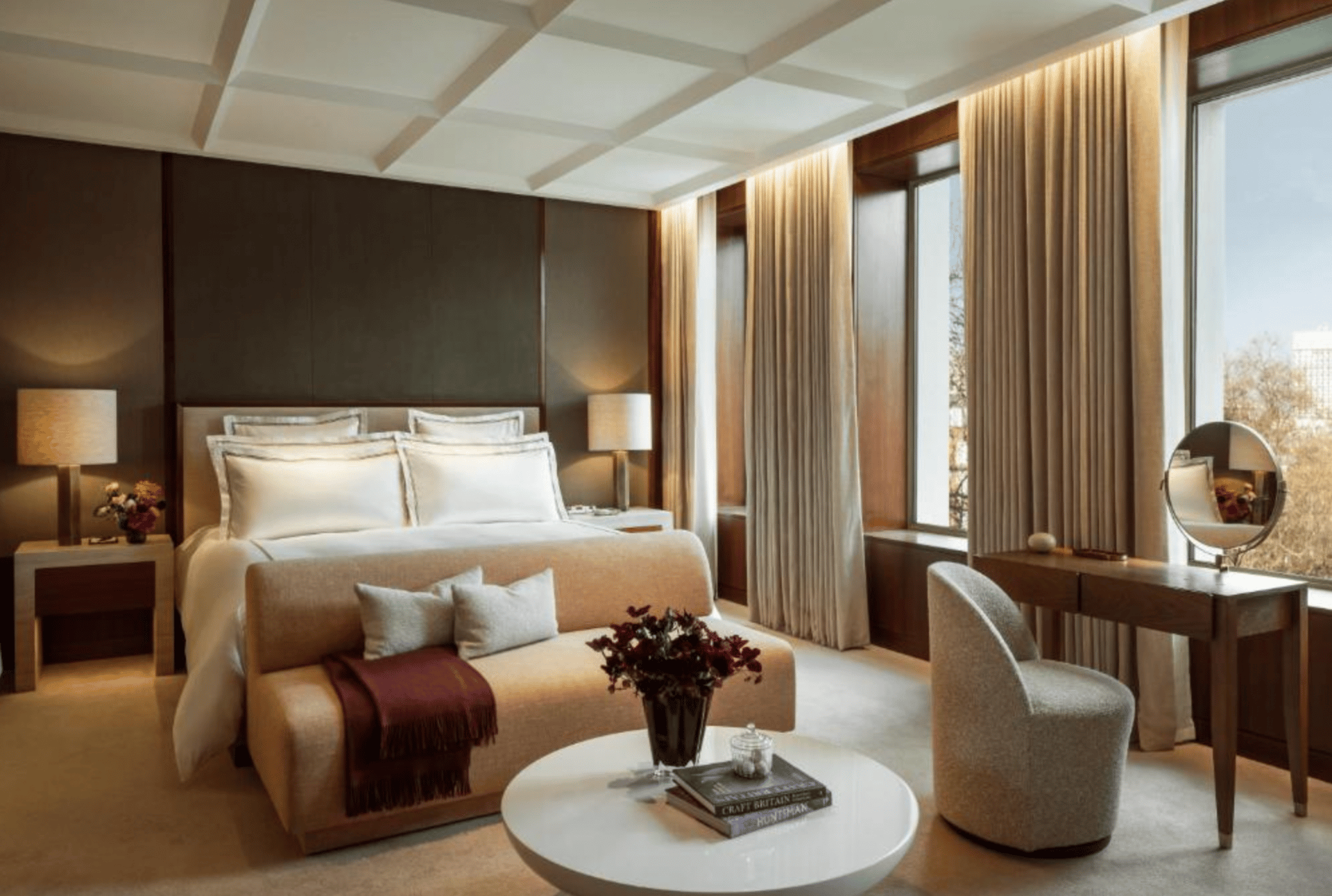 Designed by Sir David Chipperfield, with interiors by Joseph Dirand, the Grade II-listed modernist building retains its iconic eagle-topped facade while unveiling serene, spacious interiors. Suites begin at ~£1,400/night, some soaring to £60,000 for royal-level penthouses.