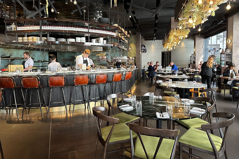 The space itself signals inclusivity. Industrial ceiling beams meet blond woods and soft banquettes, while service operates with laughter instead of whisper. The chefs often serve dishes tableside, proudly talking about waste-free methods. The crowd ranges from suited business diners to food-world pilgrims chasing their latest cult obsession.