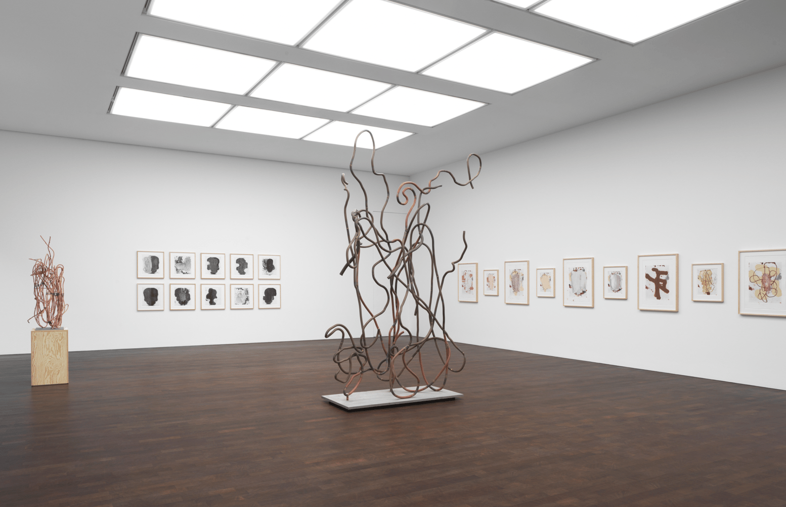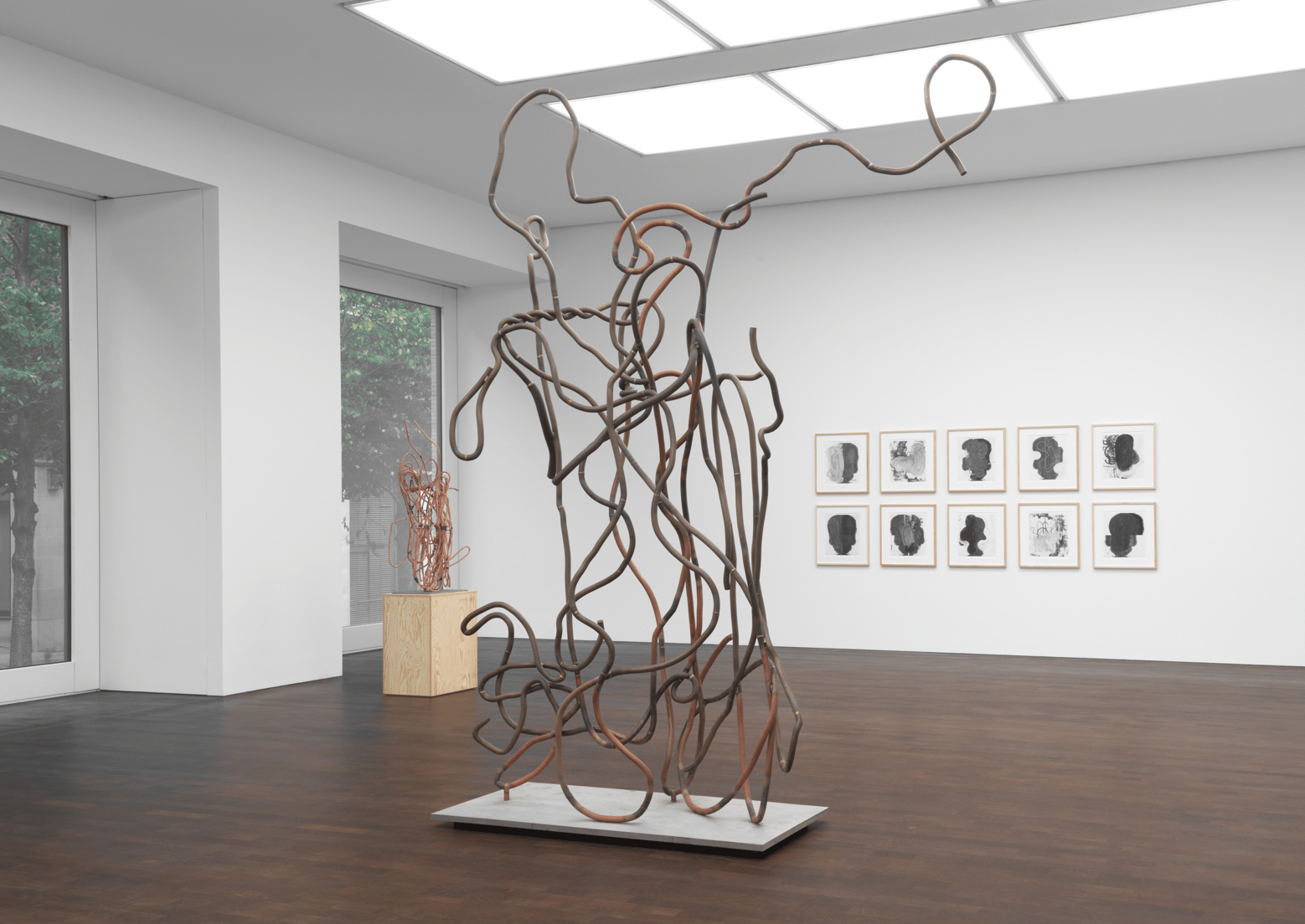 Equally striking are the sculptures: four intimate forms and two large-scale pieces cast in copper-plated steel and bronze. These originated from Wool’s home in Texas, where he collects fragments of fencing and hay-baling wire. The resulting works are rugged yet meticulous. They catch the light like relics of labor, transformed into structural poetry. The bronze surfaces glint with the memory of the ranch yard, translating found material into tangible reflection.