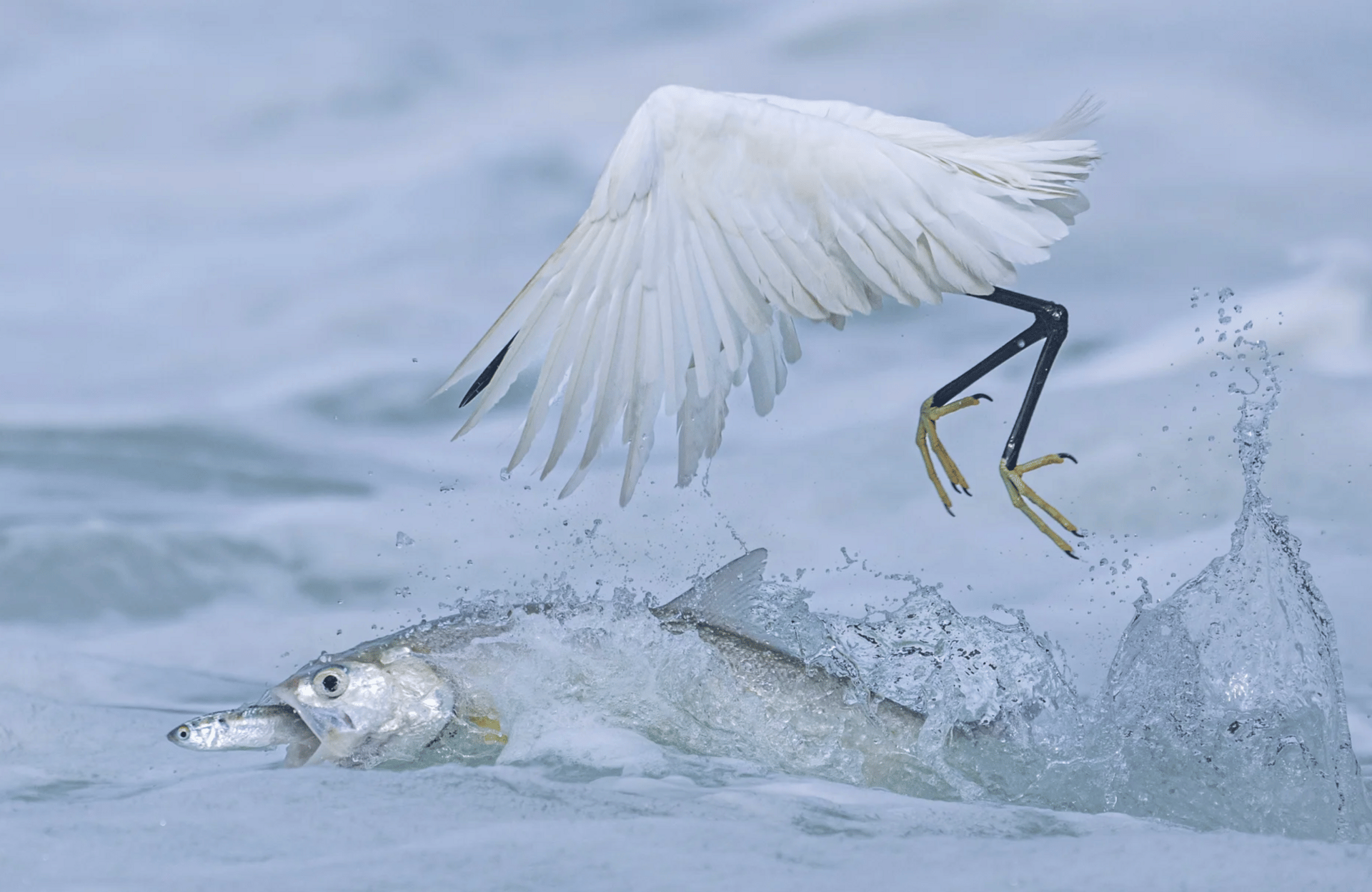 A ladyfish snatching its prey from right under an egret’s beak in Yundang Lake, Fujian province, China.