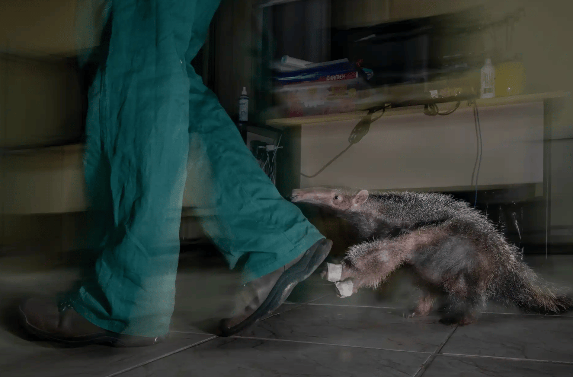 An orphaned giant anteater pup follows its caregiver after an evening feed at a rehabilitation centre in Belo Horizonte, Brazil. Faciole wanted to highlight the consequences of road collisions, a leading cause of the decline in giant anteater numbers in Brazil. This pup’s mother was killed by a vehicle, and the hope is that it will be released back into the wild after being encouraged to develop crucial survival skills by its caregiver.
