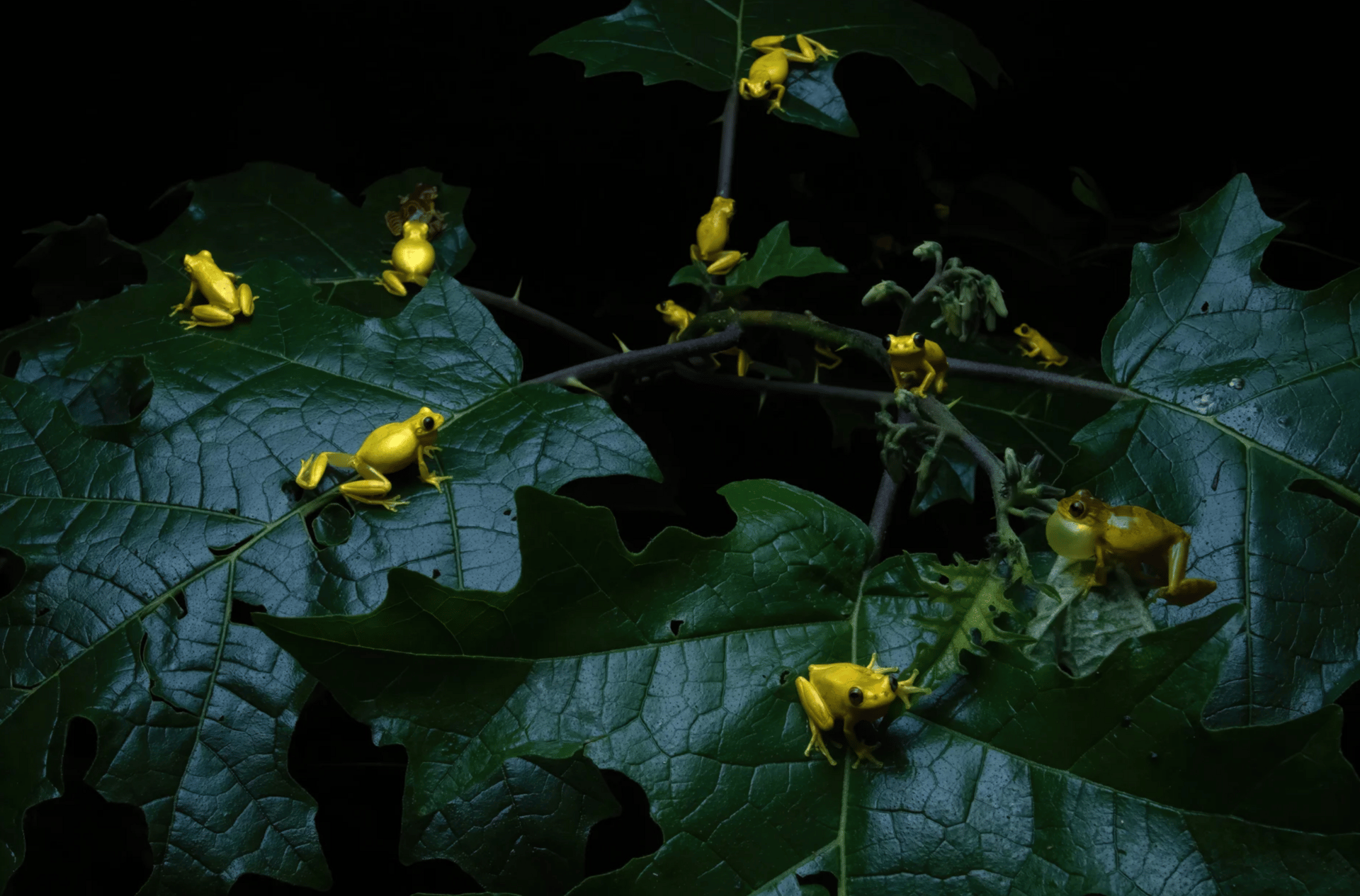 A gathering of lesser tree frogs in a breeding event on Kaw Mountain, French Guiana.