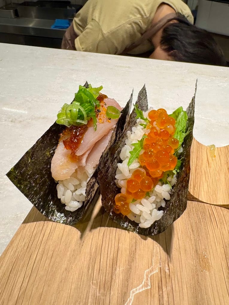 The space is compact: polished counters, slim wooden stools, tight walkways—but everything moves with rhythm and efficiency. You grab a pencil, tick your choices on a menu sheet, hand it over, and within minutes the temaki begins to roll out. It’s high-speed precision, done with heart.