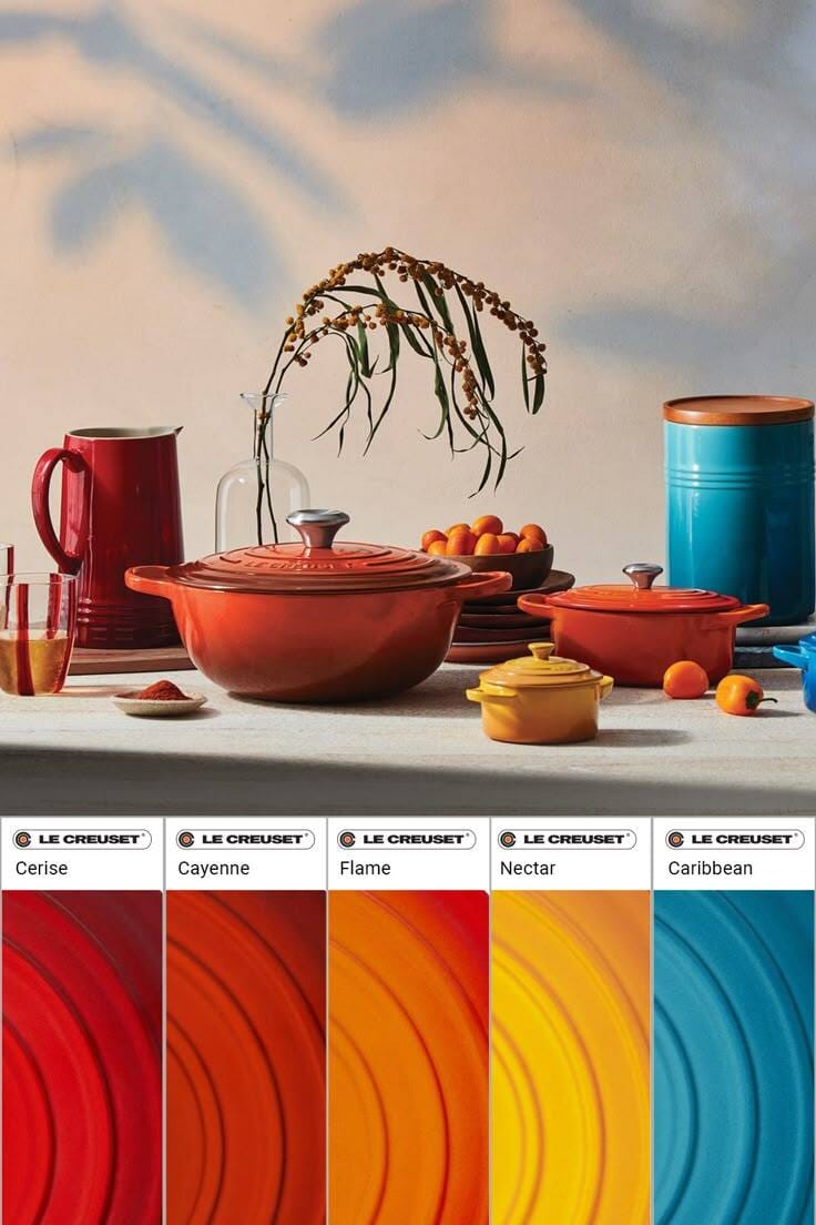 Le Creuset in Cerise red, Cayenne, classic flame, nectar and Caribbean turquoise