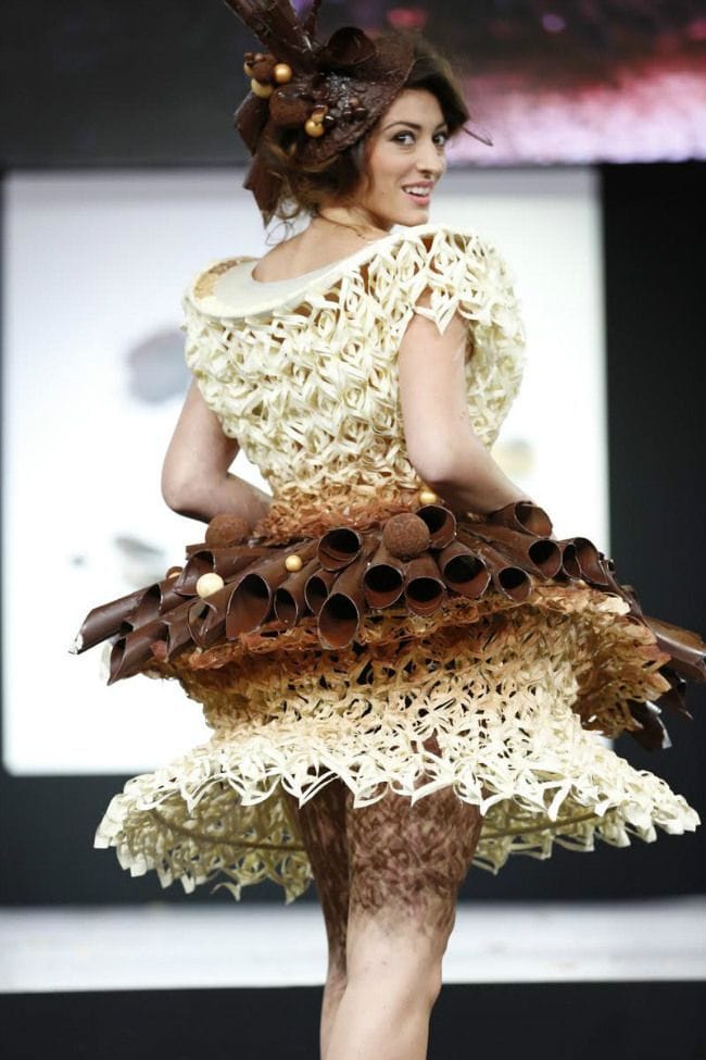 The 2025 edition introduced a festive musical performance alongside these edible ensembles, giving the runway an almost theatrical pulse. Look closer and you will notice the details: molded cocoa-paste necklaces that shimmer like bronze, satin ribbons lined with dark couverture, and models carefully adjusting to the scent cloud that follows their every step.