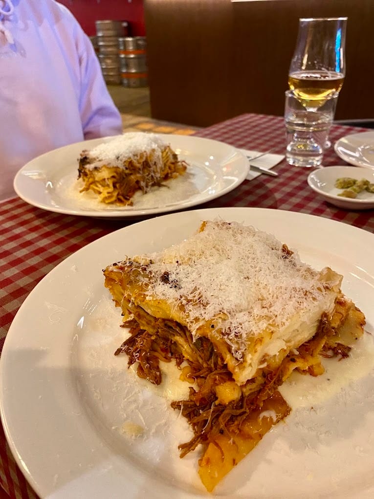 Senza Fondo is full-service and performative with servers urging “one more round?” while your fork dives again into béchamel and beef.