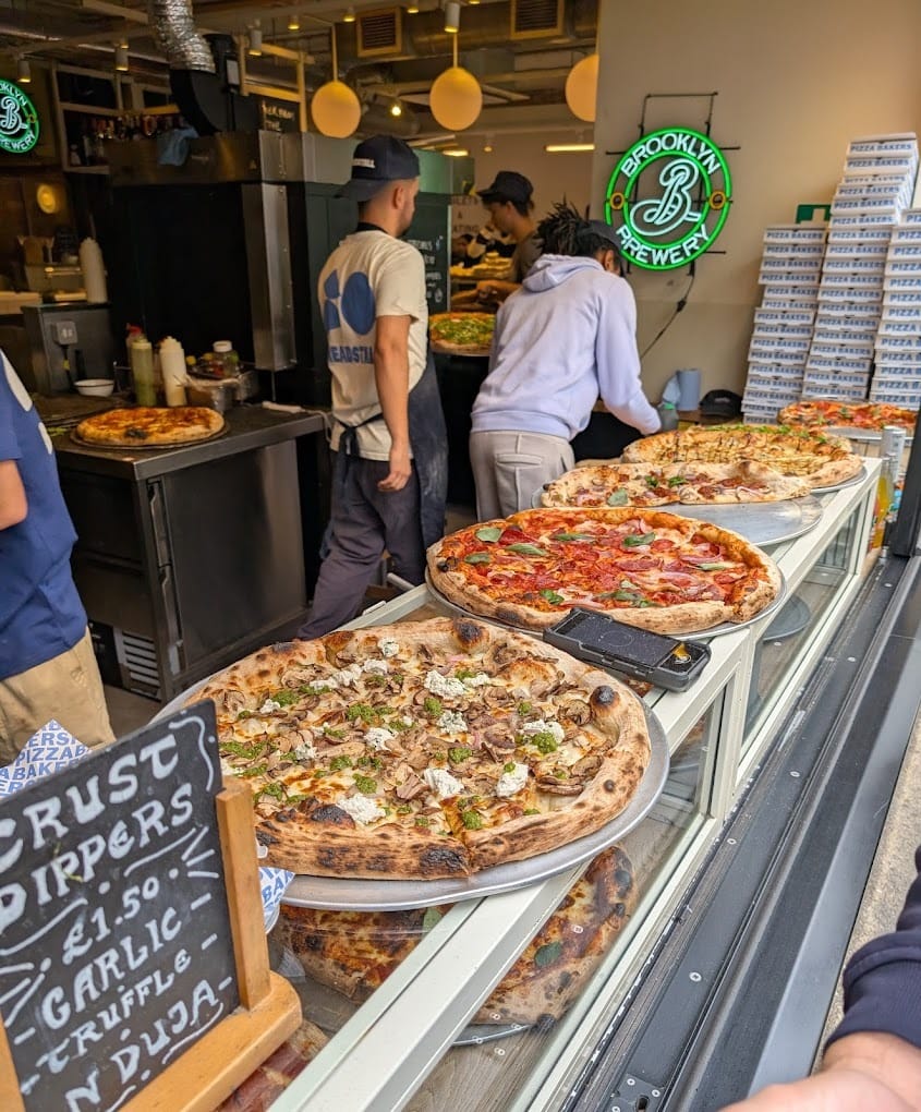 The vodka sauce slice is the standout: sweet, tangy, rich, a blush-colored sauce over a blistered base that curls at the edges. At £4 to £6 a slice, it’s casual luxury with none of the guilt. Dips are given a reverent place in the proceedings—ranch, garlic, and a spicy tomato often running out before closing. Breadstall’s menu changes regularly, but the one constant is quality dough: fermented, chewy, and crisp at once.