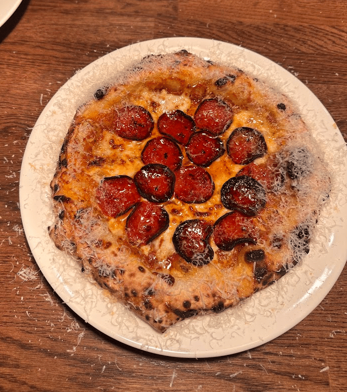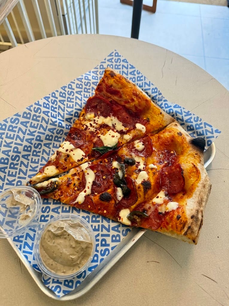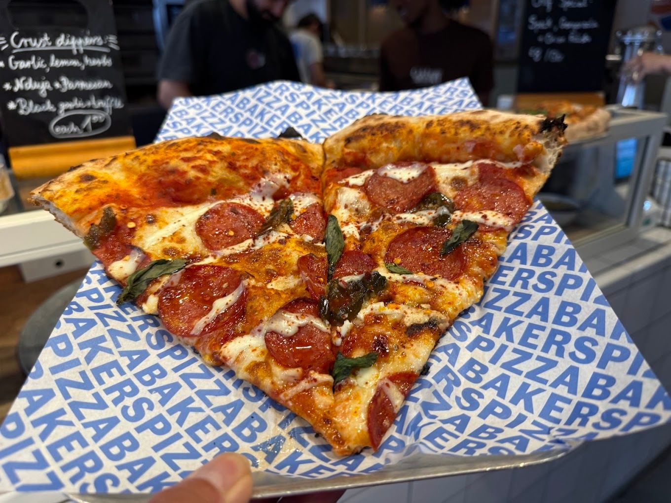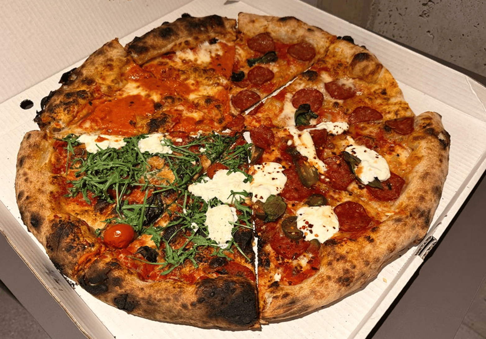 The dough is a twice-baked, slow-fermented biga base: light, crisp, with serious “tip integrity” (i.e., the slice doesn’t flop) yet retains a satisfying crust puff reminiscent of Neapolitan edges. On the topping front, expect classics like the Margherita layered with San Marzano tomato and fresh basil, or the Pepperoni with thick slices and just-right heat. Then there’s the cult favourite “New York Style Vodka Sauce” pie with cream and tomato with a cheeky splash of vodka, and a version with candied jalapeños, burrata, and hot honey for when the appetite decides to leap.