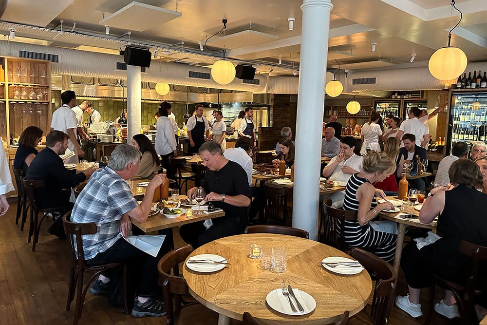 Service matches this balance of warmth and control: casual greetings, confident pacing, no unnecessary ceremony. Prices hover in the mid-to-high range (think £16 for spider crab omelette, £80 for whole turbot to share), yet there’s a democratic energy that keeps the room grounded. Loud conversations bounce off bare walls, chefs grin through the haze of smoke, and the night hums with life.