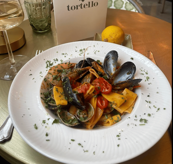The Tortello menu is a study in focus. Antipasti set you up, with easy wins like warm focaccia at £5 or arancini at £9, but the heart is in the primi. The pappardelle with beef shin ragu at £18.50 is a signature for a reason, the kind of dish that carries texture and depth without weight, while tortello di zucca at £16.50 brings a sweet savoury balance that speaks to Emilian traditions. The green spinach tagliatelle with crab at £22 shows how Tortello handles seafood without losing the pasta voice, and linguine with clams shows up for those who love shellfish as much as starch. Vegetarians are looked after beyond the fallback, with cacio e pepe and pici with sausage among the regulars, and the kitchen knows how to sauce lightly rather than flood.