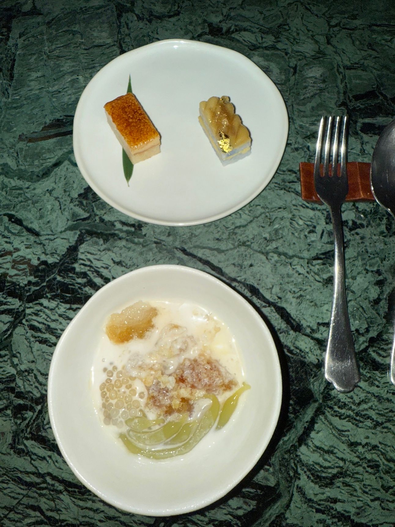 The pandan-green Candlenut chendol marries shaved young-coconut ice with smoky gula Melaka syrup. Pulut tai tai, tinted an indigo blue with pea flowers, pairs chewy rice cake with silky pandan kaya for a floral-salted finish, my personal favourite. Finally the cassava kueh arrives: a tapioca pillow under a brûléed crust that cracks with a satisfying tch, letting molten coconut sugar run onto the plate. Sweet, warm, and frankly unfair to any dessert that tries to follow.